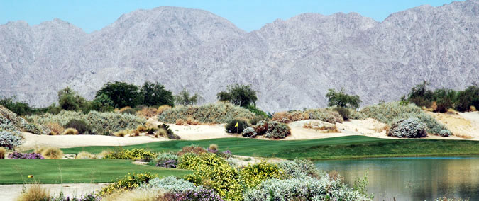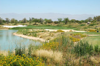 The Greg Norman Course sits near the prehistoric ocean bed 40 feet below sea level and surrounded by the Terra Cotta Mountains. Fairways are lined with natural desert plants such as multiple colors of wildflowers and native grasses that cover 60 acres of narrow fairways. This target-styled course is challenging yet fair. There are 102 white crushed marble sand bunkers and 9 ponds coming into play throughout the course.